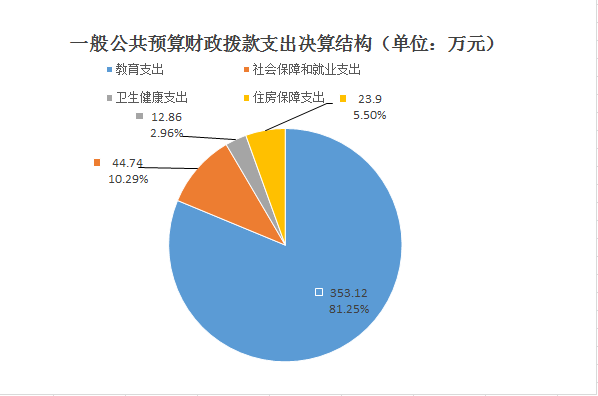 2023年度一般公共预算财政拨款支出434.61万元,主要用于以下方面:教育支出353.12万元,占81.25%;社会保障和就业支出44.74万元,占10.29%;卫生健康支出12.86万元,占2.96%;住房保障支出23.9万元,占5.5%。