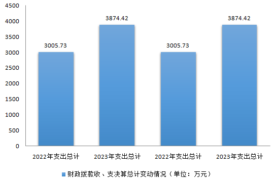 2023年度财政拨款收、支总计均为3874.42万元。与2022年度相比,财政拨款收、支总计各增加868.69万元,增长28.91%。主要变动原因为:一是教职工人数较2022年度增加,人员经费等增加;二是改善普通高中办学条件投入增加。