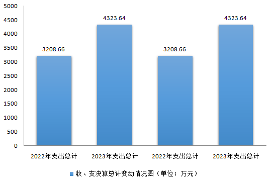 2023年度收、支总计均为4323.64万元。与2022年度相比,收、支总计各增加1114.98万元,增长34.75%。主要变动原因为:一是教职工人数较2022年度增加,人员经费等增加;二是改善普通高中办学条件投入增加。