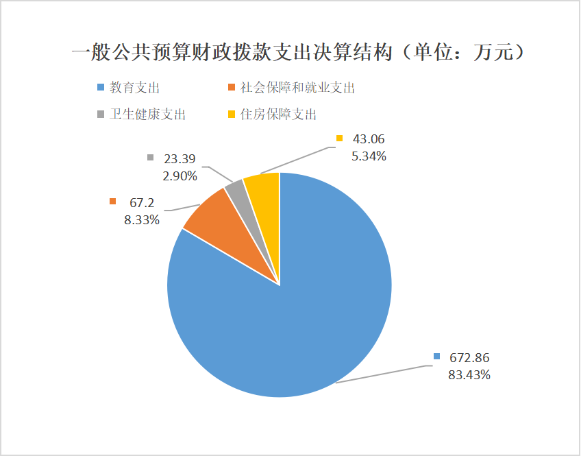 2023年度一般公共预算财政拨款支出806.51万元,主要用于以下方面:教育支出672.86万元,占83.43%;社会保障和就业支出67.20万元,占8.33%;卫生健康支出23.39万元,占2.9%;住房保障支出43.06万元,占5.34%。