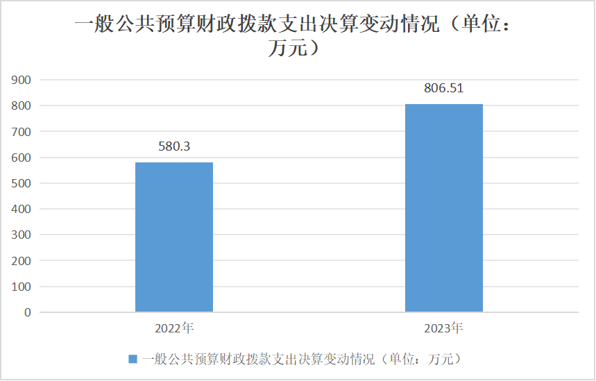 2023年度一般公共预算财政拨款支出806.51万元,占本年支出合计的97.54%。与2022年度相比,一般公共预算财政拨款支出增加226.21万元,增长38.98%。主要变动原因是工资调整,工资福利支出增加。