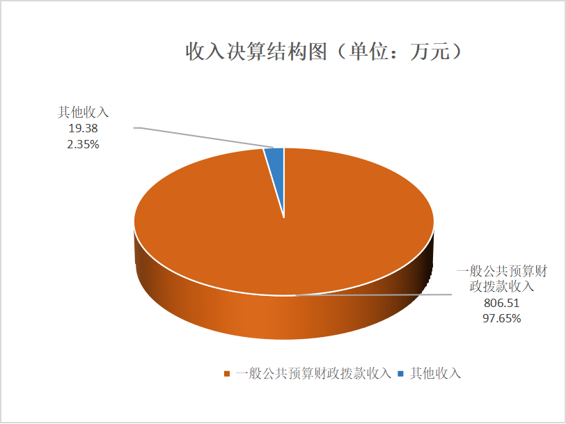2023年度本年收入合计825.89万元,其中:一般公共预算财政拨款收入806.51万元,占97.65%;其他收入19.38万元,占2.34%。