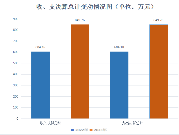 2023年度收、支总计均为849.76万元。与2022年度相比,收、支总计各减少245.58万元,下降40.65%。主要变动原因是人员退休,工资福利支出减少。