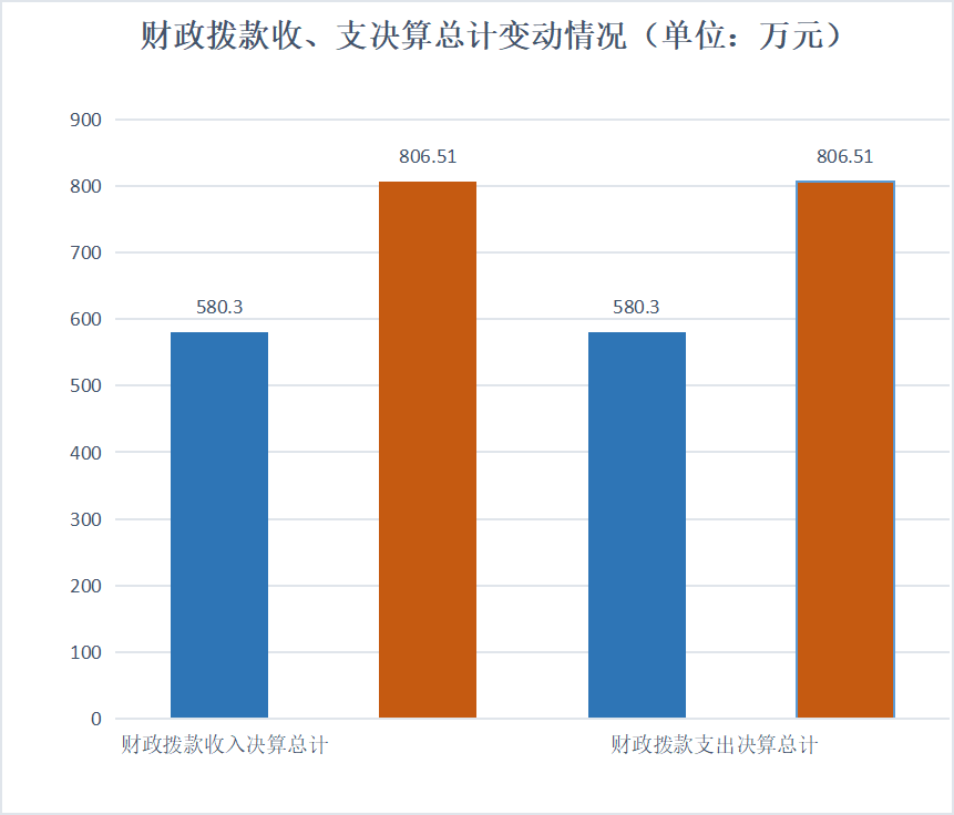2023年度财政拨款收、支总计均为806.51万元。与2022年度相比,财政拨款收、支总计各增加226.21万元,增长38.98%。主要变动原因是工资调整,工资福利支出增加。