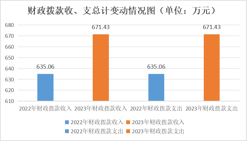2023年度财政拨款收、支总计均为671.43万元。与2022年度相比,财政拨款收、支总计各增加36.37万元,增长5.73%。主要变动原因是一是教师正常晋升及岗位变动工资增加,二是退休一次性补贴增加,三是生均财政拨款增长。