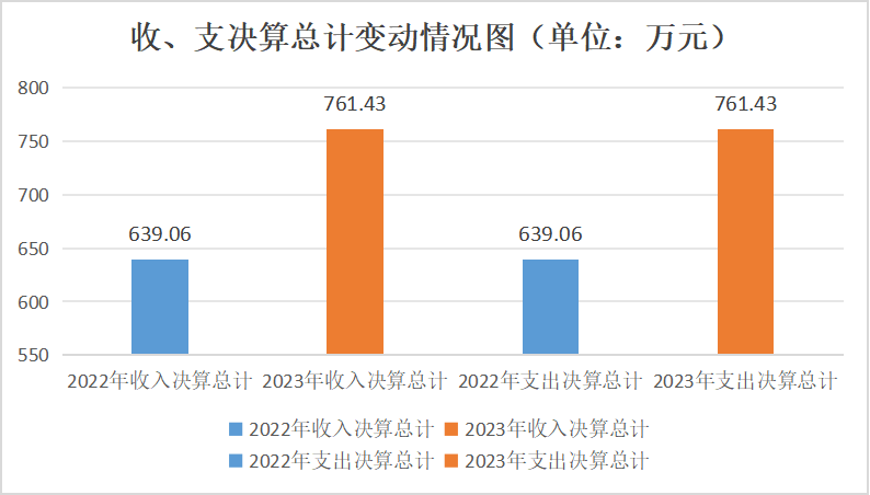2023年度收、支总计均为761.43万元。与2022年度相比,收、支总计各增加122.37万元,增长19.15%。主要变动原因是一是教师正常晋升及岗位变动工资增加,二是退休一次性补贴增加,三是生均财政拨款相应增长。