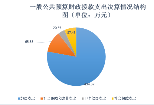 2023年度一般公共预算财政拨款支出557.61万元,主要用于以下方面:主要用于以下方面:教育支出434.07万元,占77.84%;社会保障和就业支出65.55万元,占11.75%;卫生健康支出20.55万元,占3.68%;住房保障支出37.43万元,占6.71%.