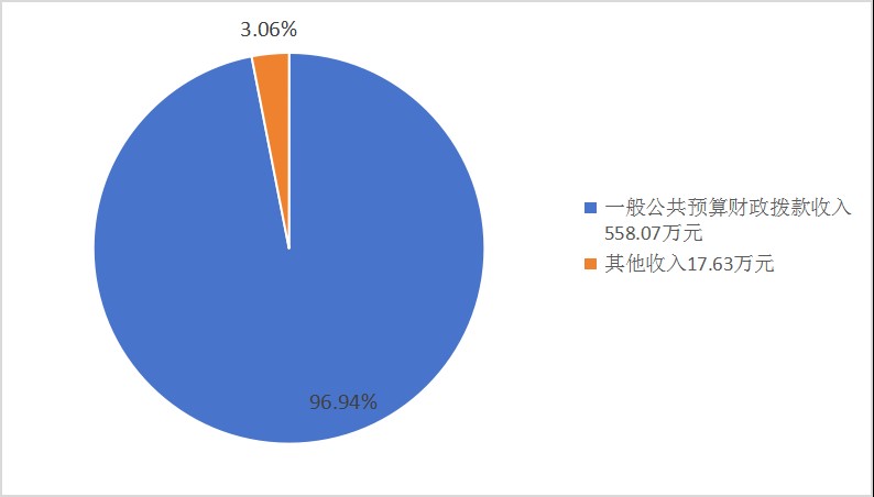 2023年度本年收入合计575.71万元,其中:一般公共预算财政拨款收入558.07万元,占96.94%;政府性基金预算财政拨款收入0万元,占0%;国有资本经营预算财政拨款收入0万元,占0%;上级补助收入0万元,占0%;事业收入0万元,占0%;经营收入0万元,占0%;附属单位上缴收入0万元,占0%;其他收入17.63万元,占3.06%