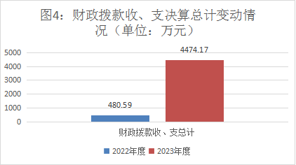 2023年度财政拨款收、支总计均为4474.17万元。与2022年度相比,财政拨款收、支总计各增加增加3993.58万元,增长830.97%。主要变动原因是项目资金增加。