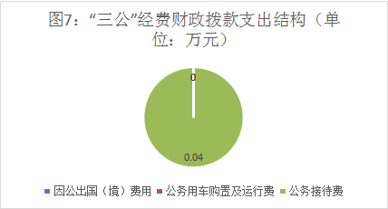 2023年度“三公”经费财政拨款支出决算中,因公出国(境)费支出决算0万元,占0%;公务用车购置及运行维护费支出决算0万元,占0%;公务接待费支出决算0.04万元,占100%。具体情况如下:
