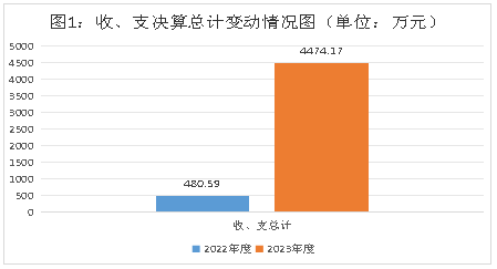 2023年度收、支总计均为4474.17万元。与2022年度相比,收、支总计各增加3993.58万元,增长830.97%。主要变动原因是项目资金增加。