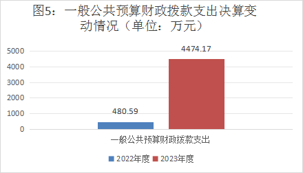 2023年度一般公共预算财政拨款支出4474.17万元,占本年支出合计的100%。与2022年度相比,一般公共预算财政拨款支出增加3993.58万元,增长830.97%。主要变动原因是项目资金增加。