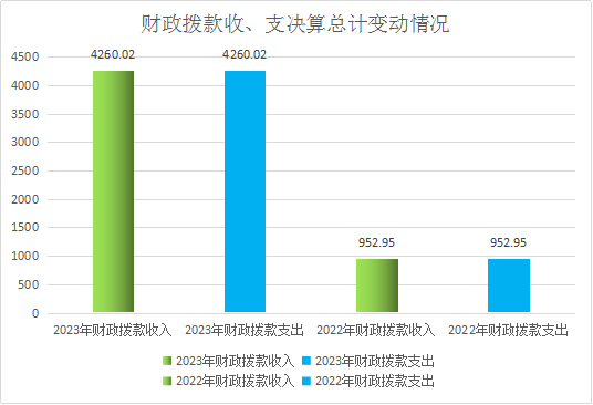 2023年度财政拨款收、支总计均为4260.02万元,2022年度财政拨款收、支总计均为952.95万元;与2022年度相比,财政拨款收、支总计各增加3307.07万元,增长347.03%。主要变动原因是人员工资调增和债券项目资金增加。