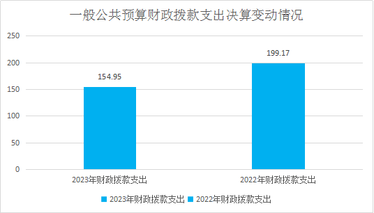 2023年度一般公共预算财政拨款支出154.95万元,占本年支出合计的2.5%。2022年度一般公共预算财政拨款支出199.17万元;与2022年度相比,一般公共预算财政拨款支出减少44.22万元,下降22.2%。主要变动原因是2022年有65万元医疗服务能力提升项目资金,2023年没有。