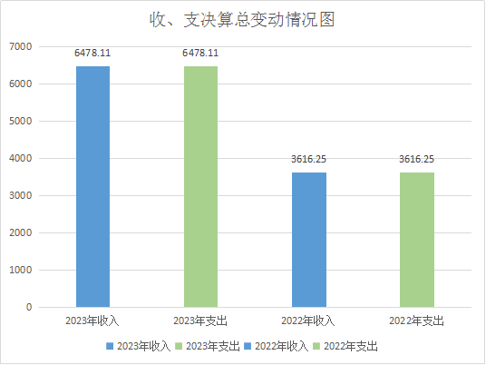 2023年度收、支总计均为6478.11万元;2022年度收、支总计均为3616.25万元。与2022年度相比,收、支总计各增加2861.86万元,增长79.14%。主要变动原因是收入增加的原因是债券项目资金增加。