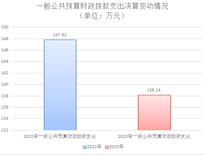 2023年度一般公共预算财政拨款支出138.14万元,占本年支出合计的66.93%。与2022年度相比,一般公共预算财政拨款支出减少9.67万元,下降6.54%。主要变动原因为公用经费支出减少。