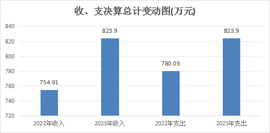 2023年度收、支总计均为823.9万元。与2022年度相比,收、支总计减少78.12万元,下降9.48%。主要变动原因是辖区人口减少,导致项目资金收入减少。