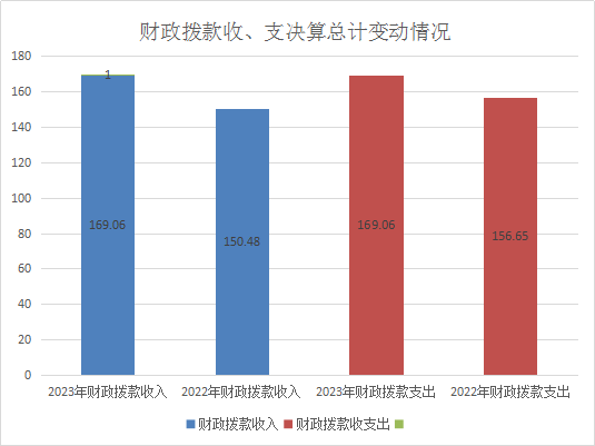 2023年度财政拨款收、支总计均为169.06万元。与2022年度相比,财政拨款收入总计增加18.58万元,增长12.35%、支出总计增长12.41万元,增长7.92%。主要变动原因是正常人员调资人员经费增加,上年度项目结转,基础绩效奖全部计入保险基数,单位部分预算增加。