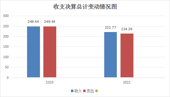 2023年度收、支总计均为249.44万元。与2022年度相比,收入总计增加27.67万元,增长12.48%、支出总计增加35.18万元,增长16.41%。主要变动原因是财政拨款收入增加,事业收入增加,医疗业务成本有所增加。
