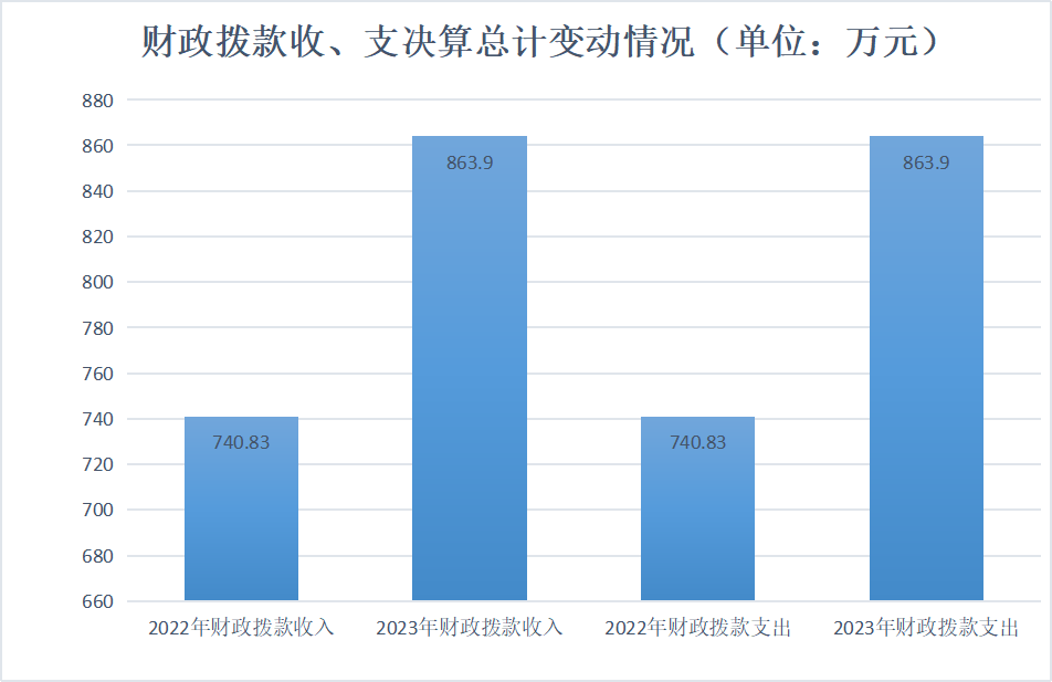 2023年度财政拨款收、支总计均为863.9万元。与2022年度相比,财政拨款收、支总计各增加123.07万元,增长16.61%。主要变动原因一是教育支出增加,二是社会保障和就业支出增加,三是生均财政拨款和教育事业收入相应增长等。