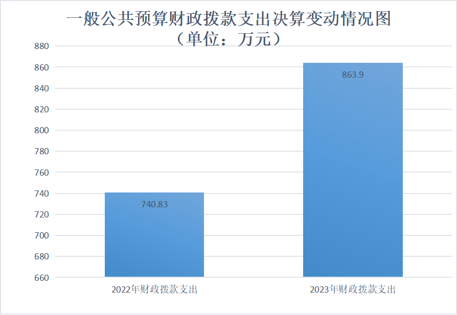 2023年度一般公共预算财政拨款支出863.9万元,占本年支出合计的95.89%。与2022年度相比,一般公共预算财政拨款支出增加123.07万元,增长16.61%。主要变动原因是一是教育支出增加,二是社会保障和就业支出增加。