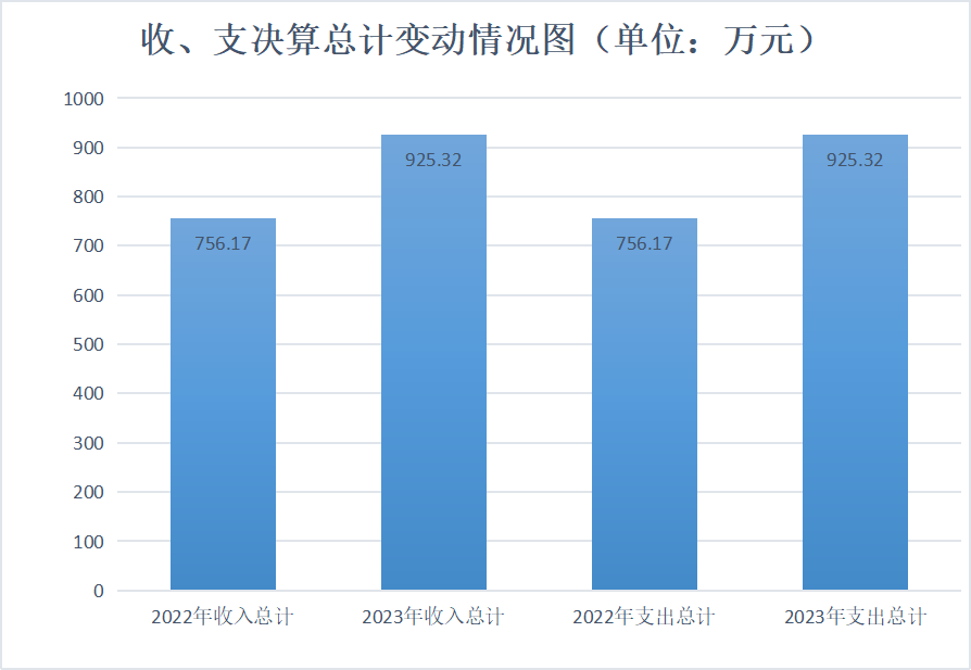 2023年度收、支总计均为925.32万元。与2022年度相比,收、支总计各增加169.15万元,增长22.37%。主要变动原因一是教育支出增加,二是社会保障和就业支出增加,三是生均财政拨款和教育事业收入相应增长等。