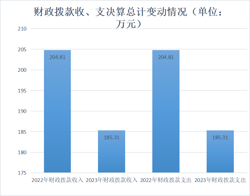 2023年度财政拨款收、支总计均为185.31万元。与2022年度相比,财政拨款收、支总计各减少19.5万元,下降9.5%。主要变动原因是:主要因为教师人数减少人员经费减少,工资福利支出减少。