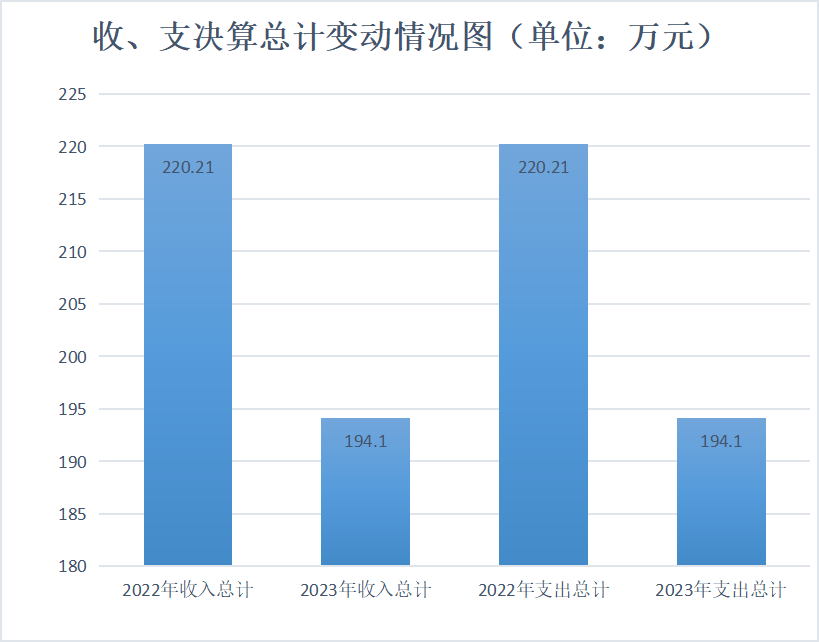 2023年度收、支总计均为194.1万元。与2022年度相比,收、支总计各减少26.11万元,下降11.85%。主要变动原因是:教师人数减少导致人员经费减少,幼儿人数减少使教育事业收入和财政拨款减少。
