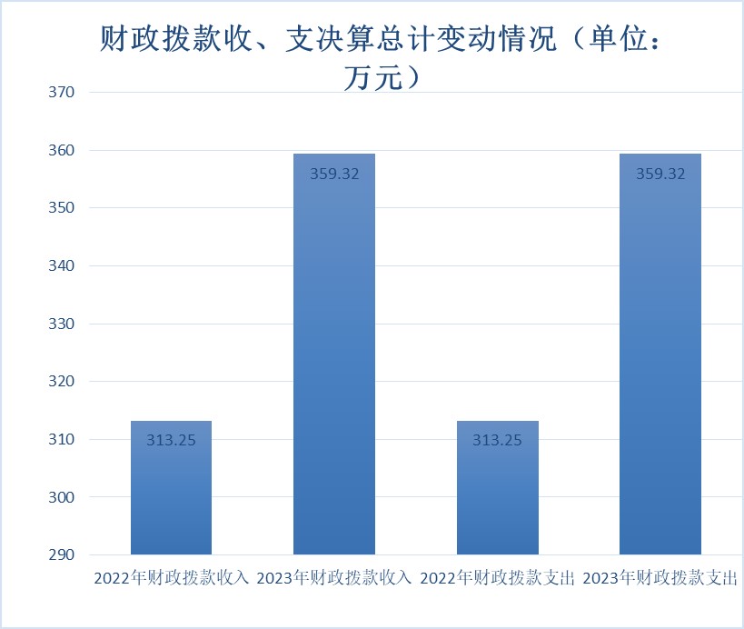 2023年度财政拨款收、支总计均为359.32万元。与2022年度相比,财政拨款收、支总计各增加46.07万元,增长14.71%。主要变动原因一是教师正常晋升及岗位变动工资增加,教师人数增加。
