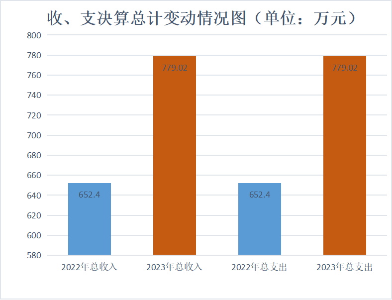 2023年度收、支总计均为779.02万元。与2022年度相比,收、支总计各增加126.62万元,增长16.25%。主要变动原因是一是教师正常晋升及岗位变动工资增加,二是退休一次性补贴增加,三是生均财政拨款增长等。