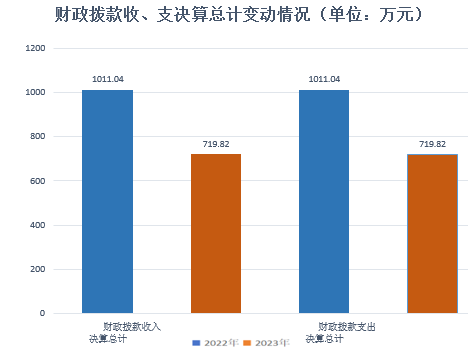 2023年度财政拨款收、支总计均为719.82万元。与2022年度相比,财政拨款收、支总计各减少291.22万元,下降28.8%。主要变动原因是人员减少,工资福利支出减少。