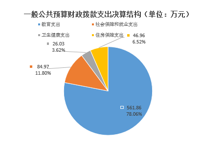 2023年度一般公共预算财政拨款支出719.82万元,主要用于以下方面:教育支出561.86万元,占78.06%;社会保障和就业支出84.97万元,占11.8%;卫生健康支出26.03万元,占3.62%;住房保障支出46.96万元,占6.52%。