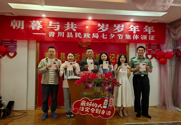 2025年8月29日是我国传统的 “七夕”节,青川县民政局为5对新婚夫妻举办了“朝暮与共·岁岁年年”为主题的集体颁证仪式。