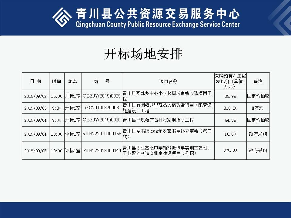 2019年9月2日-6日开标场地安排