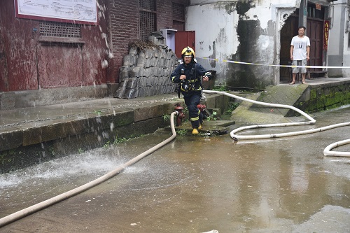 当天上午9时,在马健指示下,青川县2019年文物消防应急演练开始。某省级文保单位发生火情,白家乡相关负责人报警并赶赴火灾现场,拉警示带隔离,疏散人群;县消防救援大队接到报警后,火速赶往现场救援,用消防栓扑灭明火,救出伤员;医疗救助队抢救伤员;县文物应急抢险队冲进火场抢救文物;白家乡和县消防救援大队报告救援情况,隐患已排除;最后,马健宣布演练结束。
