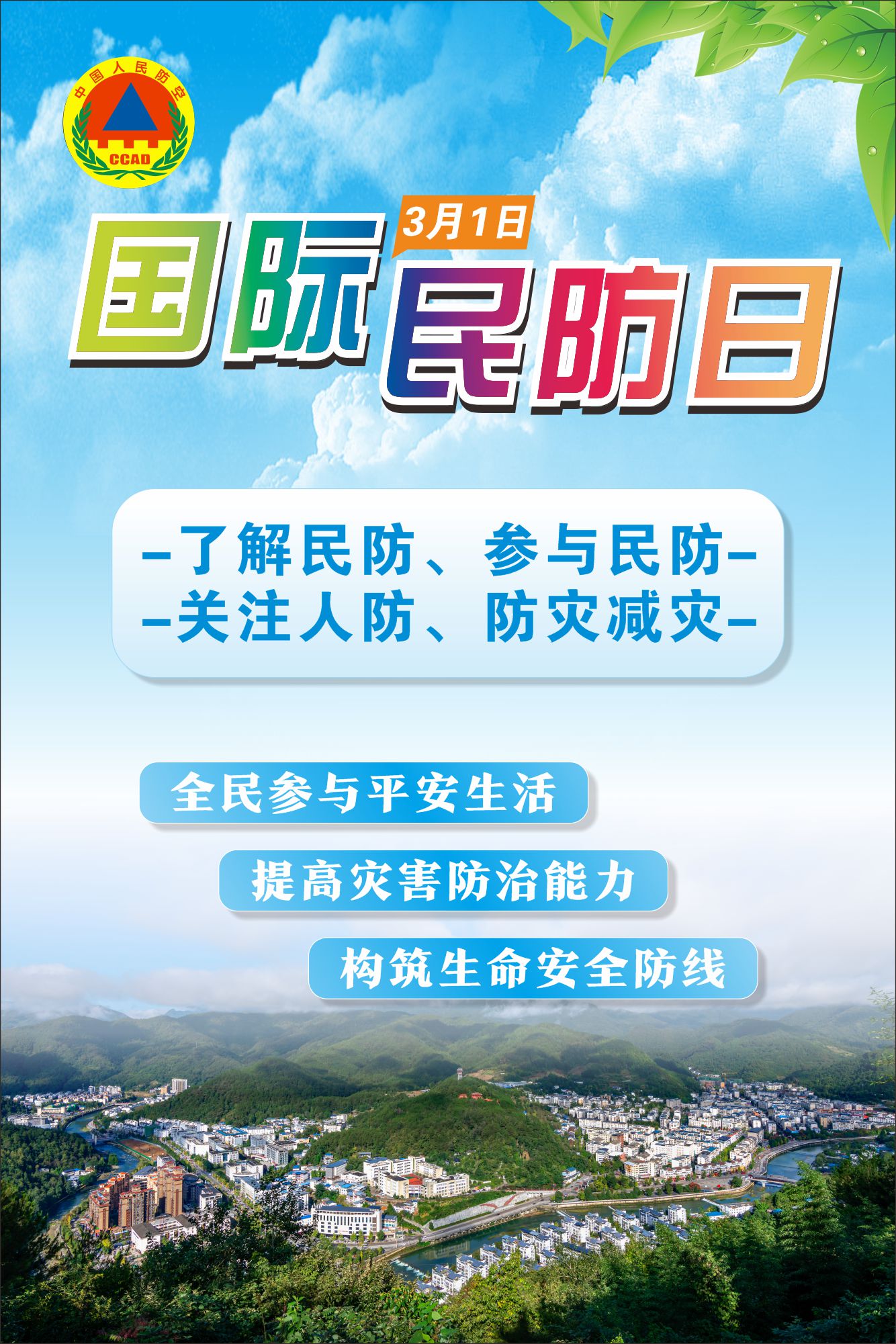 每年的3月1日是国际民防组织统一确定的“国际民防日”,设立世界民防日的目的是为了加强公众对国际民防组织任务的认识:即保护生命、财产和环境。我国1992年加入国际民防组织。