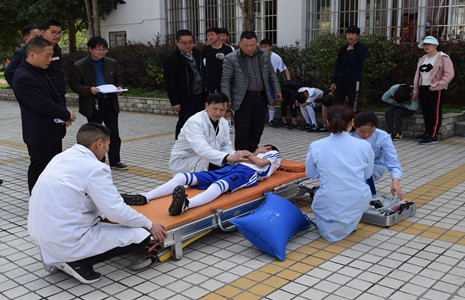 茶坝乡卫生院医生快速到达现场进行初步救治,认定为食物中毒疑似病例,并指挥相关人员将重症患者送至医院治疗。同时,总务处主任陈虎安排人员查看早餐的饭菜和原材料,封存留样饭菜,保留食品用具、容器和学生呕吐、排泄物,以便疾控中心检验。最后,该校分管副校长孙元礼宣布演练结束。