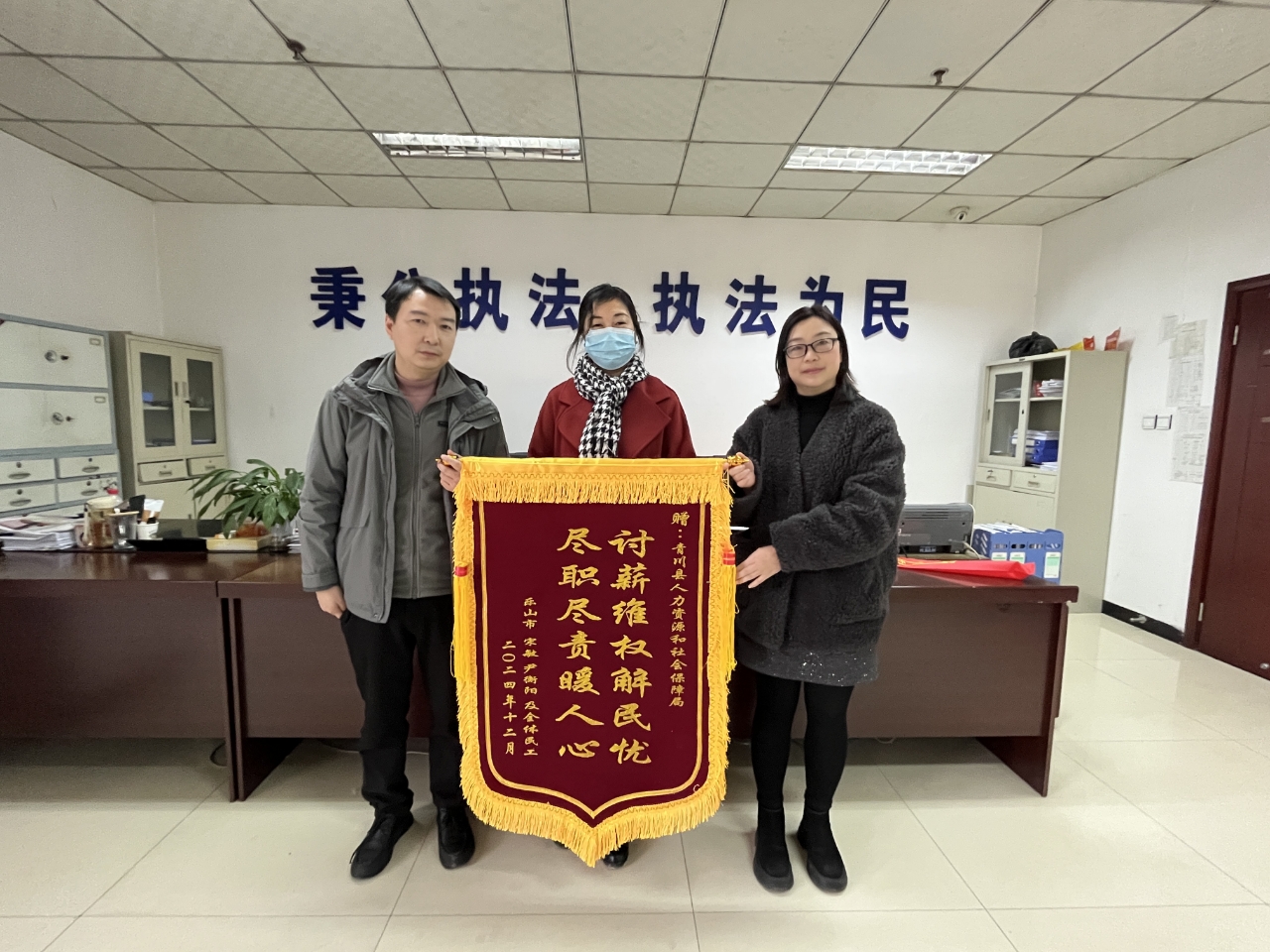 2024年12月,农民工代表向县人社局赠送锦旗,以表县人社局“快马加鞭”为38名农民工追回被拖欠工资39.98万元的感激之情。