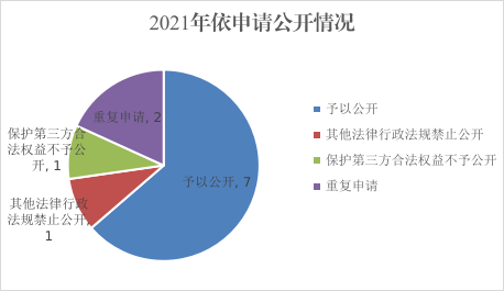 拓宽依申请公开受理渠道,在县政府门户网站设立依申请公开栏,同时接收纸质、电话等依申请公开诉求,扎实做好依申请公开接收、登记、办理、调查、答复等各个环节。2021年,县政府办公室收到政府信息公开申请共11件,其中予以公开7件,因其他法律行政法规禁止公开1件,因保护第三方合法权益不予公开1件,重复申请2件,均已按时办理回复。