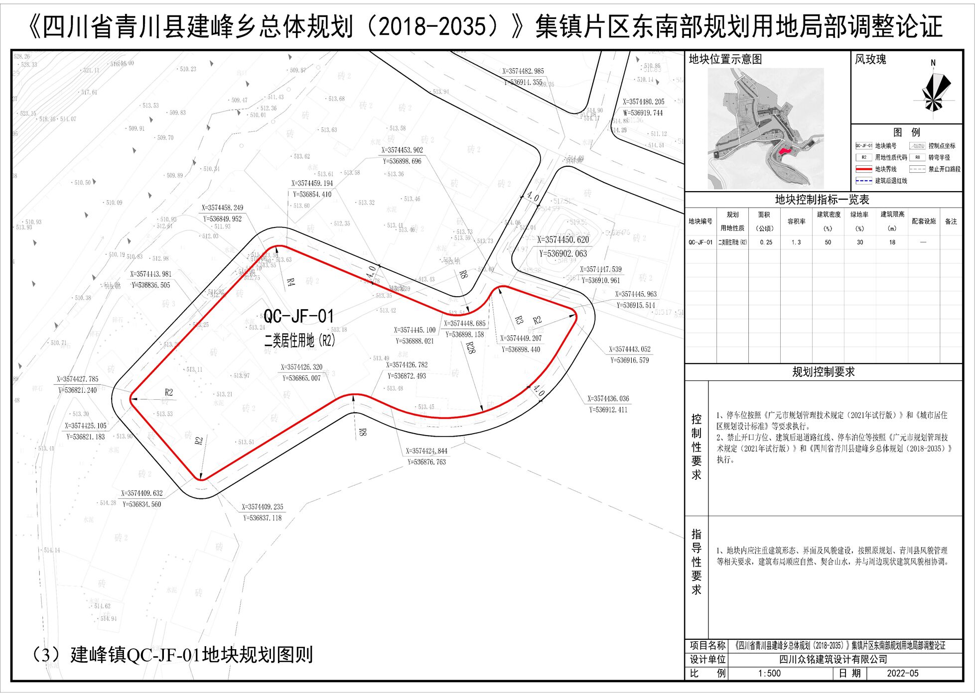 原规划未提出地块指标控制要求。本报告通过测算现状镇区的建设开发水平、考虑干部周转房建设需要以及参考相关规划和规范标准的控制要求等,提出QC-JF-01地块(干部周转房所在地块)的容积率控制在1.3以内,建筑密度≤50%、绿地率≥30%、建筑限高≤18米。禁止开口方位、建筑后退道路红线、停车泊位等按照《广元市规划管理技术规定(2021年试行版)》和原规划执行。