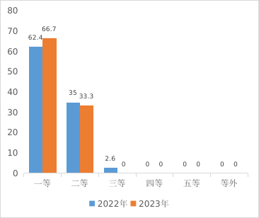 (二)花生。花生纯仁率均值73.6%,为一等,较上年增加0.8%,变幅69.1%~75.8%,其中一等占比50%,二等占比50%,三等以上占比100.0%,具体见图2;含油率均值45.9%,变幅45.2%~46.3%,不完善粒总量均值2.3%,变幅0.6%~4.7%,其中病斑粒均值1.6%,变幅0.0%~4.4%,生芽粒均值0.1%,变幅0.0%~0.7%,未熟粒均值0.5%,变幅0.1%~1.2%。
