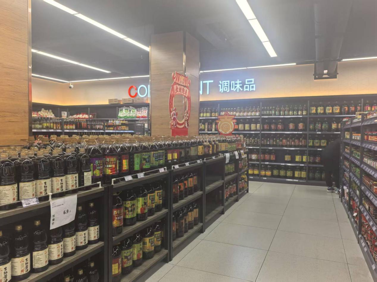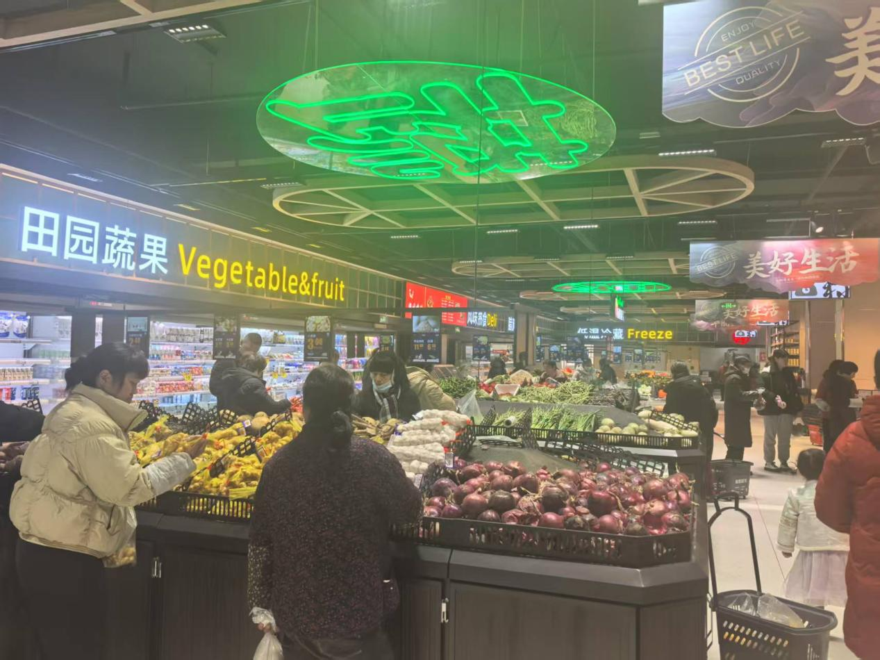 在县城超市中,货物琳琅满目,品类丰富,货源充足。消费者喜爱的节日礼品、零食等商品摆满各个货架,各种新鲜水果、蔬菜、肉类、米、面、油数量充足,品种齐全。