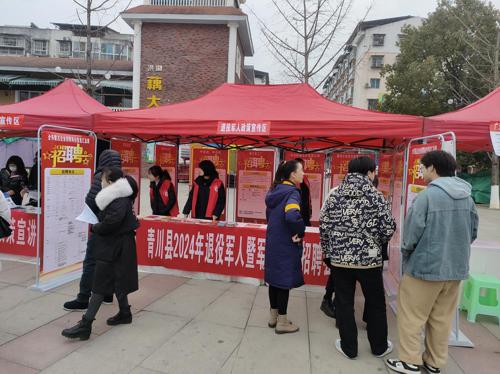 在2024年“西湖·青川”东西部劳务协作暨农民工专场招聘活动期间,青川县退役军人事务局同步举办青川县2024年退役军人暨军属专场招聘会,招聘活动于2024年1月30日在县城明欣广场举行,县退役军人事务局提供70余家优质企业参会,包括石油勘探、汽车制造、电子商务、商贸物流等岗位1000余个,满足退役军人及军属多层次就业需求。