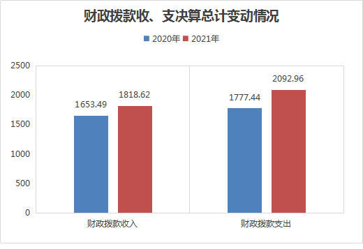2021年度财政拨款收入总计1818.62万元,财政拨款支出支出总计2092.96万元。与2020年相比,财政拨款收入总计各增加165.13万元,增长10%。主要变动原因是招考录用在编人员增加导致的辖区人员类收入增加。与2020年相比,财政拨款支出总计增加315.52万元,增长17.75%。主要变动原因是招考录用在编人员增加,人员类开支增多。