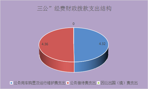 2021年“三公”经费财政拨款支出决算中,因公出国(境)费支出决算0万元,年初未安排预算;公务用车购置及运行维护费支出决算4.32万元,占49.77%;公务接待费支出决算4.36万元,占50.23%。具体情况如下: