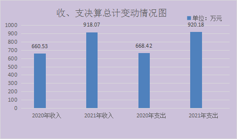 2021年度收、支总计918.07万元、920.18万元。与2020年相比,收、支总计各660.53万元、668.42万元各增加257.54万元、251.76万元,增长38.99%、37.66%。主要变动原因是编制内实有人数增加,人员经费增加。