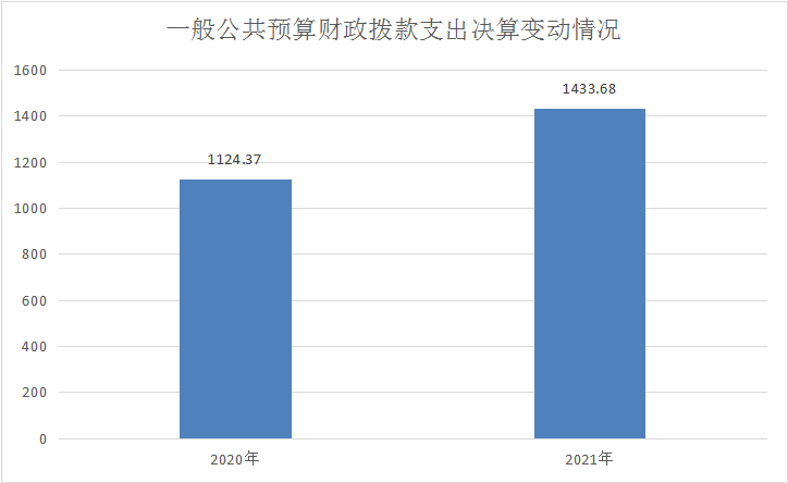 五、一般公共预算财政拨款支出决算情况说明 (一)一般公共预算财政拨款支出决算总体情况2021年一般公共预算财政拨款支出1433.68万元,占本年支出合计的100%。与2020年相比,一般公共预算财政拨款支出增加309.31万元,增长27.51%。主要变动原因是编制内实有人数增加,人员基本支出及日常事务公用支出收支增加。