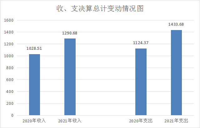 四、财政拨款收入支出决算总体情况说明 2021年财政拨款收入总计1290.68万元、支出总计1433.68万元。与2020年相比,财政拨款收入总计增加262.17万元、增长25.49%,支出总计增加309.31万元,增长27.51%。主要变动原因是编制内实有人数增加,人员基本支及日常事务公用支出收支增加。
