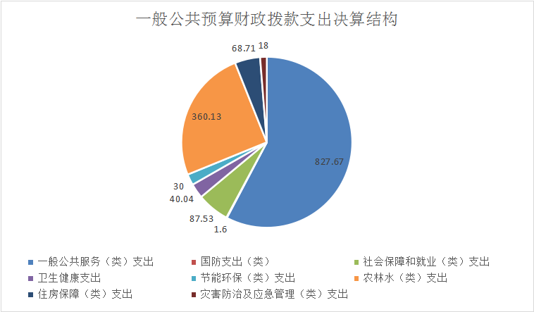 (二)一般公共预算财政拨款支出决算结构情况 2021年一般公共预算财政拨款支出1433.68万元,主要用于以下方面:一般公共服务(类)支出827.67万元,占57.73%;国防支出(类)1.6万元,占0.11%;社会保障和就业(类)支出87.53万元,占6.11%;卫生健康支出40.04万元,占2.79%;节能环保(类)支出30万元,占2.09%;农林水(类)支出360.13万元,占25.12%;住房保障(类)支出68.71万元,占4.79%;灾害防治及应急管理(类)支出18万元,占1.26%。