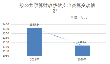 2021年一般公共预算财政拨款支出1355.54万元,占本年支出合计的100%。与2020年相比,一般公共预算财政拨款支出增加190.44万元,增长16.35%。主要变动原因是人员增加。